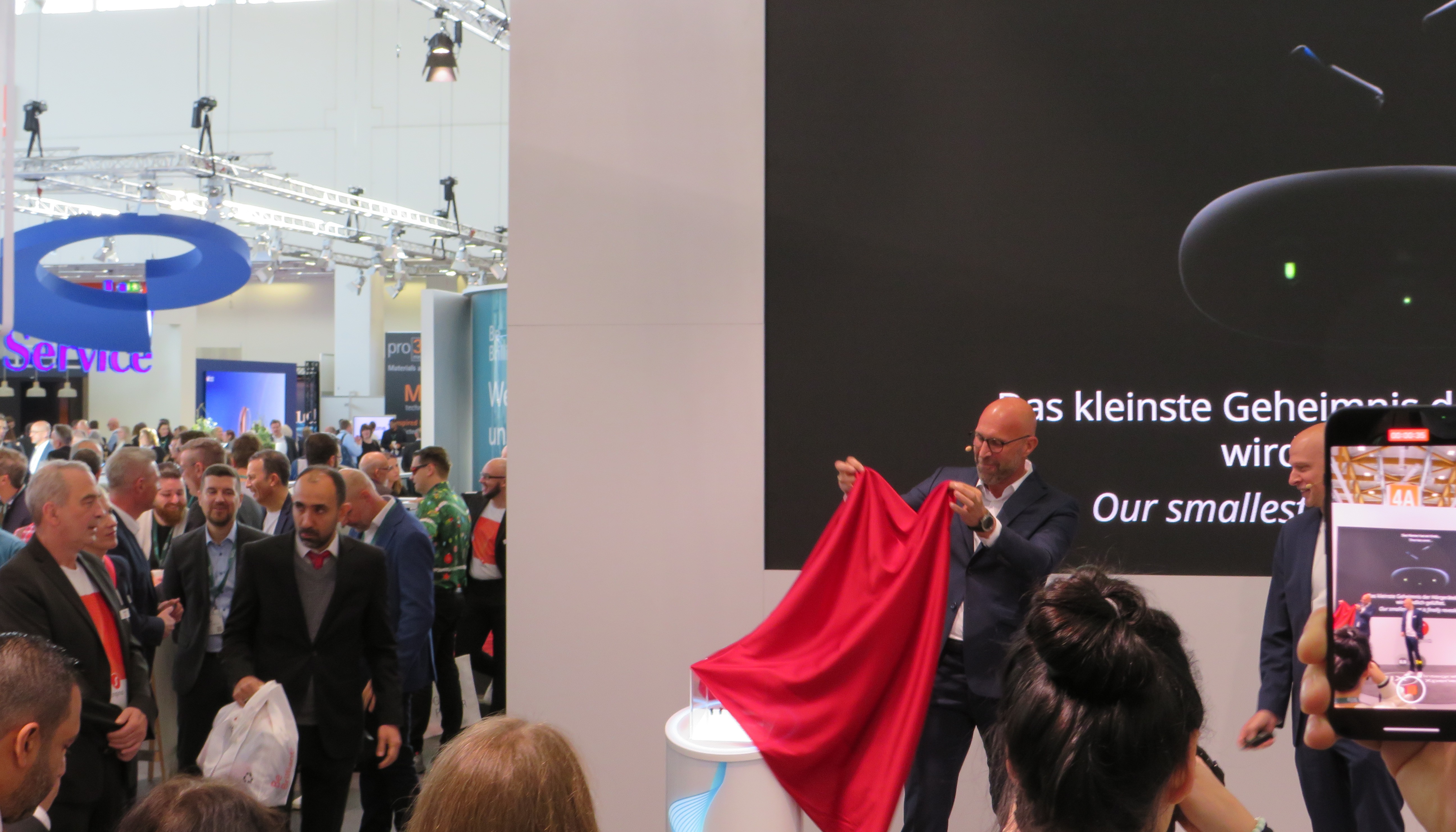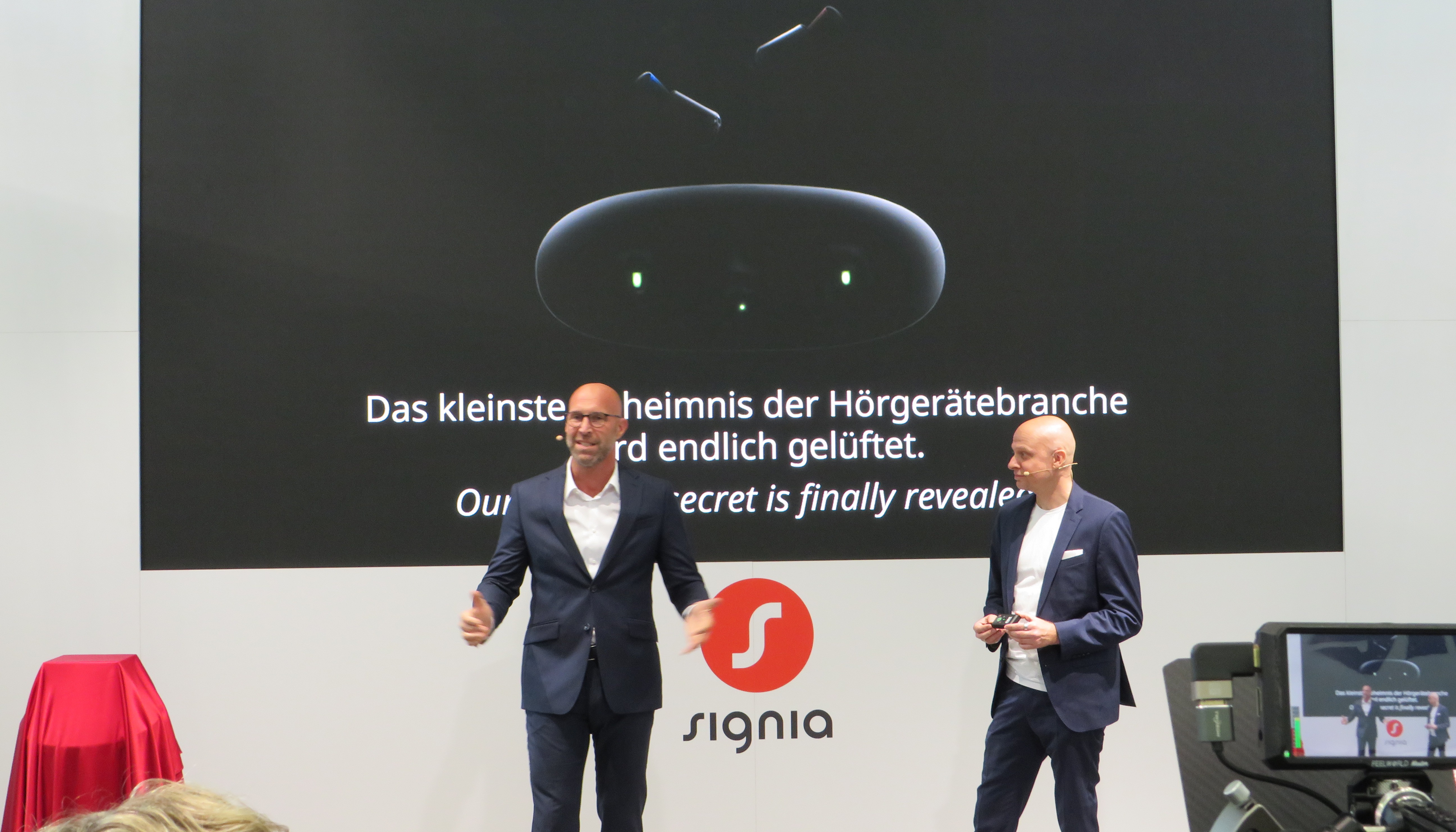 Stand-Premiere: Pünktlich zum EUHA-Start lüfteten Signia-Chef Christian Honsig und Audiologie-Leiter Sascha Haag das "kleinste Geheimnis".