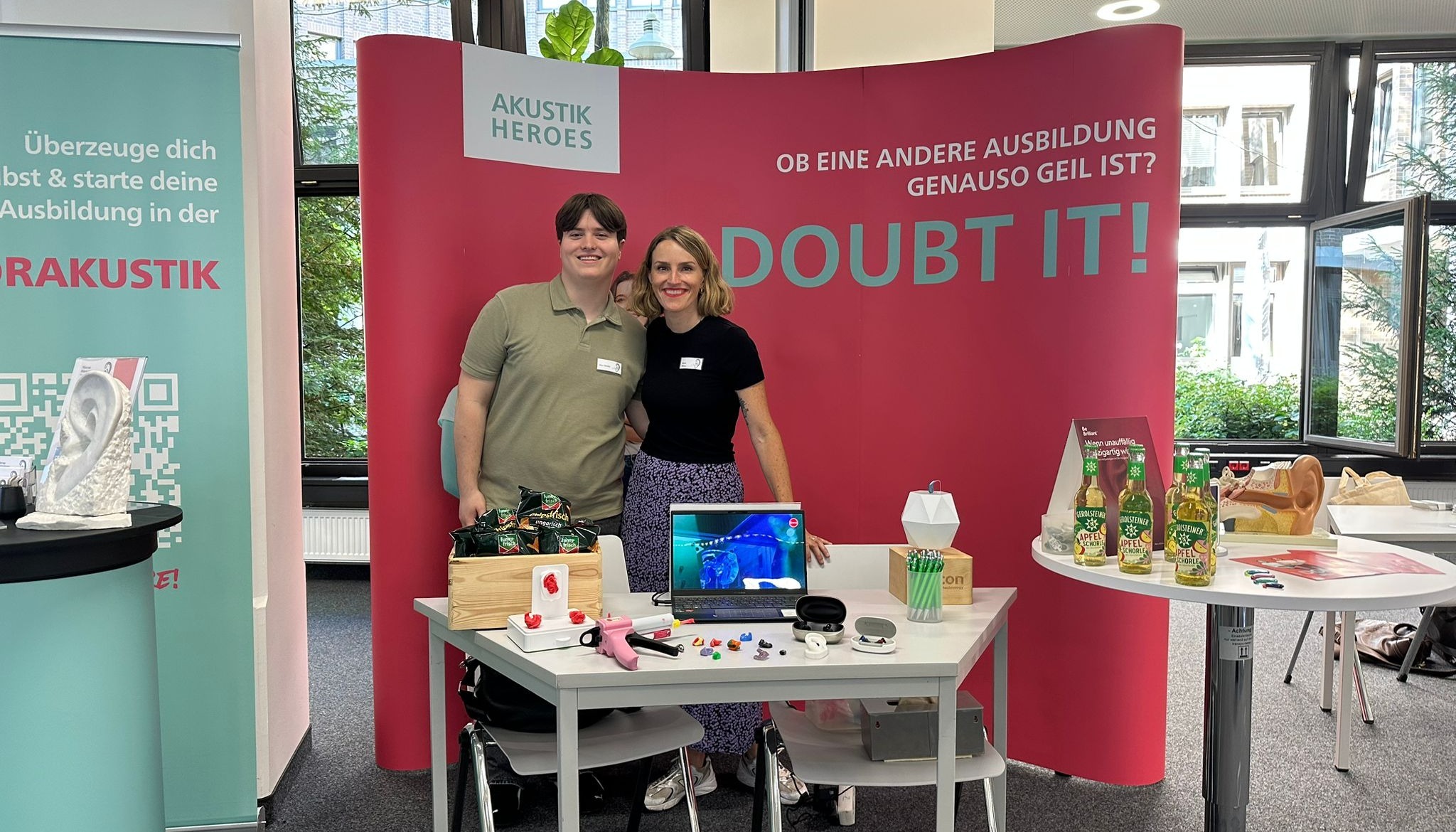Die Unterstützung erfolgt auf verschiedenen Ebenen. Zum einen online über die Kampagnenseite www.akustik-heroes.de, auf der die Betriebe ihre freien Azubi-Stellen kostenlos inserieren können. Zum anderen gibt es ein zielgerichtetes Offline-Paket mit Plakaten und Bannern, um im eigenen Geschäft auf das Lehrstellen-Angebot hinzuweisen. Als flankierende Option gibt es zudem einen professionell gestalteten Messestand im Verleih, um sich als Unternehmen auf Berufsinformationstagen, Ausbildungsmessen etc. entsprechend aufmerksamkeitsstark zu präsentieren.